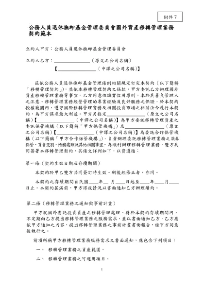 公務人員退休撫卹基金管理委員會國外資產移轉管理業務契約範本(草案)