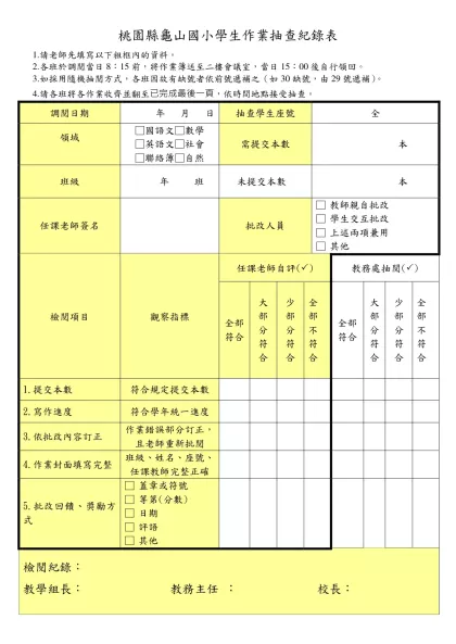 臺北縣重慶國小學生作業抽查紀錄表-桃園縣龜山國小學生作業抽查紀錄表
