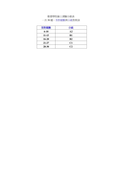 歌德學院線上測驗分級表-一共30題,答對題數與分級對照表