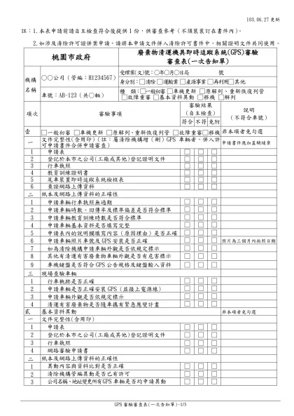 桃園縣廢棄物(GPS)審驗申請及審查表單-註:1.本表申請前請自主檢查符合後提供1份,供審查
