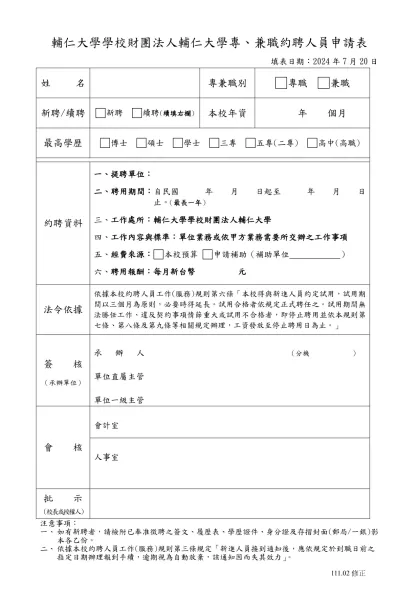 輔仁大學 (單位)聘用專、兼職約聘人員申請表-輔仁大學學校財團法人輔仁大學專、兼職約聘人員申