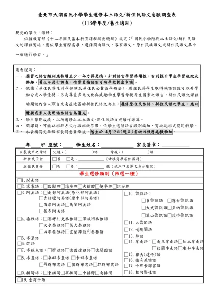 臺北市民族國小學生選修鄉土語言意願調查表-臺北市大湖國民小學學生選修本土語文/新住民語文意願調查表