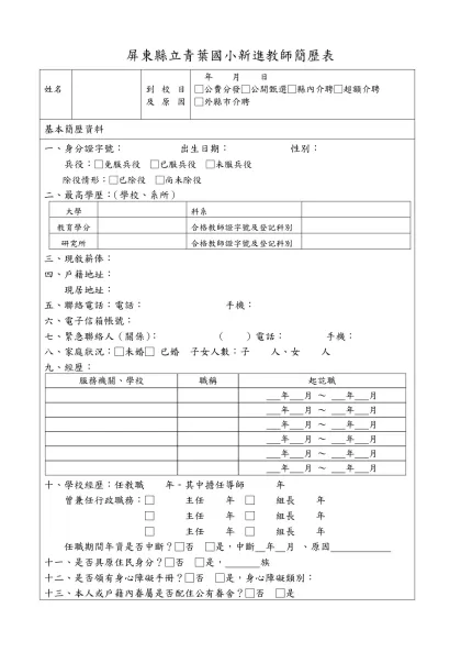 臺中市立黎明國民中學新進教師簡歷表-屏東縣立青葉國小新進教師簡歷表
