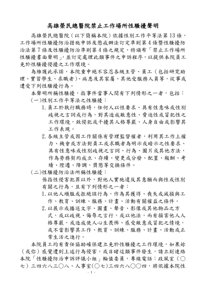 性騷擾防治措施、申訴及懲戒辦法 範本-高雄榮民總醫院禁止工作場所性騷擾聲明