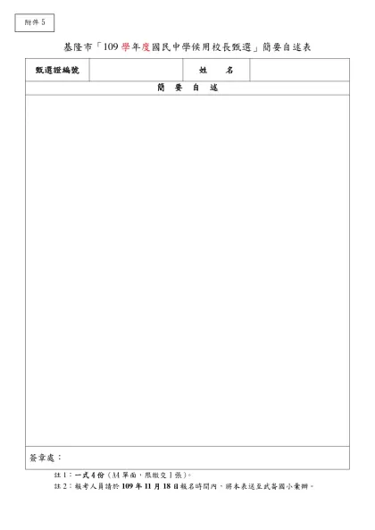 基隆市「109學年度國民中學候用校長甄選」簡要自述表