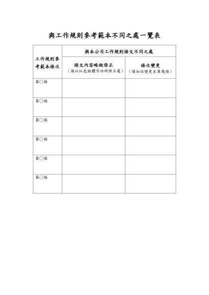 與工作規則參考範本不同之處一覽表
