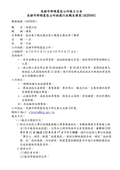 人事室徵才訊息---里幹事-高雄市那瑪夏區公所徵才公告