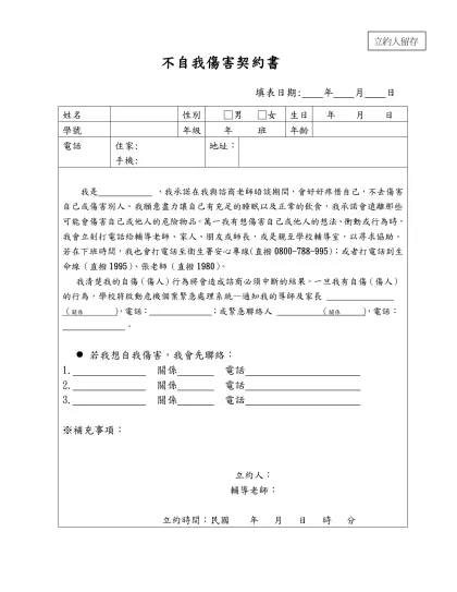 不自殺契約書-不自我傷害契約書- 填表日期: 年 月 日姓名性別