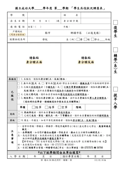 國立成功大學 九十 學年度第 學期 男生兵役狀況調查表-國立成功大學_____學年度 第___學期 「學生兵役狀況調查表」