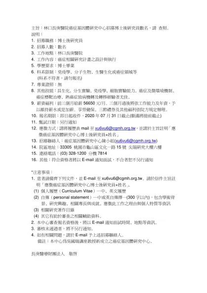 主旨:林口長庚醫院癌症基因體研究中心招募博士後研究員數名,請 查照。