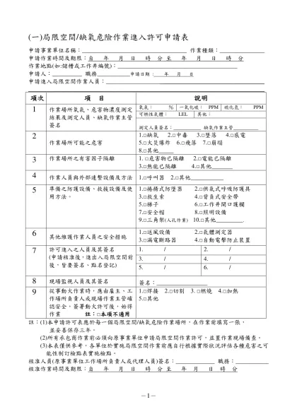 一、侷限空間危害Q&A-(一)局限空間/缺氧危險作業進入許可申請表