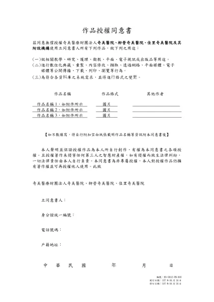 作品授權同意書-作者授權-茲同意無償授權奇美醫療財團法人奇美醫院、柳營奇美醫院、佳里奇美醫院及其附設機構使用立同意書人所有下列作品,做下列之用途: