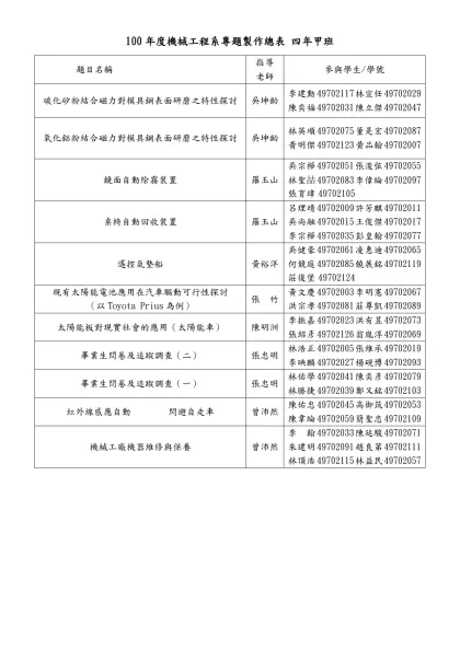 100年度機械工程系專題製作成績總表 四年甲班