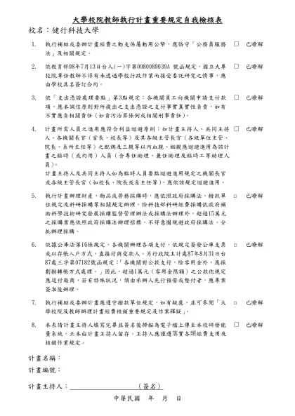 計畫執行重要規定自我檢核表範例(草案)-大學校院教師執行計畫重要規定自我檢核表