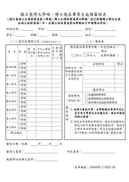 國立臺灣大學研究所屆畢業研究生成績審核表