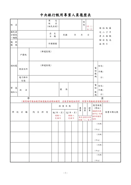 公務人員履歷表-中央銀行甄用專業人員履歷表