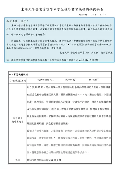 東海大學企業管理學系學生校外實習機構職缺提供表