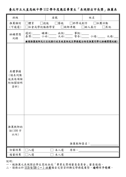 表現傑出學生推薦表-臺北市立大直高級中學112學年度應屆畢業生「表現傑出市長獎」推薦表