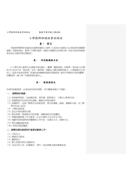 小學教師班級經營的做法-前言班級經營簡單的說就是在處理班級的人事物,它是每位老師每天必須面對的課題與挑戰,班級經營好,教學工作勝任愉快,教師才會擁有自信與自尊,因此有效的班級經營是每位老師所殷切期盼的