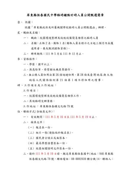 屏東縣政府(文化處)約僱人員公開甄選簡章【範例】-屏東縣恆春國民中學臨時鐘點計時人員公開甄選簡章