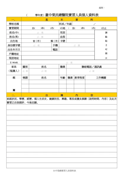 ( 學年度)臺中榮民總醫院實習人員個人資料表