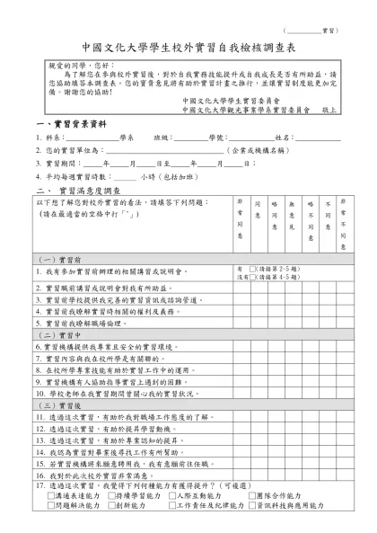 技專校院學生校外實習問卷調查表-中國文化大學學生校外實習自我檢核調查表