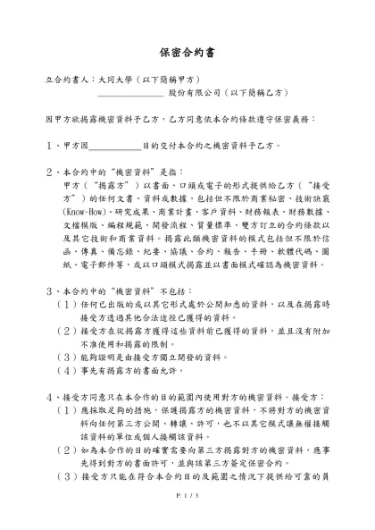 保密合約書-立合約書人:大同大學(以下簡稱甲方)
