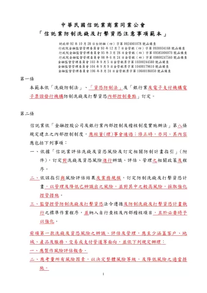 「銀行防制洗錢注意事項」範本-中華民國信託業商業同業公會