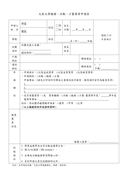 元智大學社團服務學習獎學金申請辦法-元智大學服務、活動、才藝獎章申請表