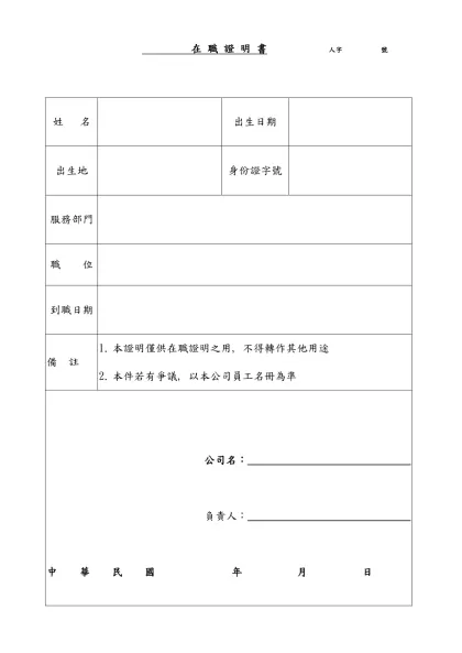 在 職 證 明 書 人字 號-姓 名出生日期出生地身份證字號
