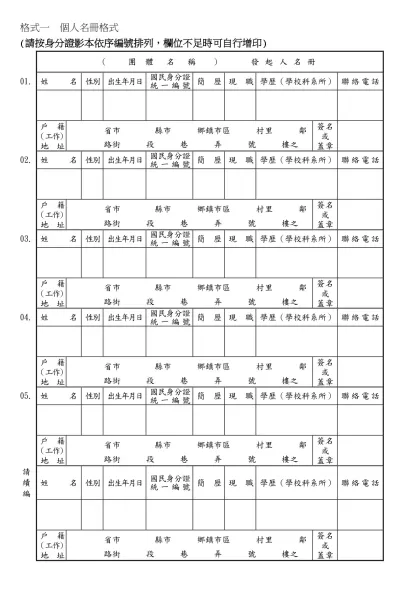 格式一 個人名冊格式-(請按身分證影本依序編號排列,欄位不足時可自行增印)
