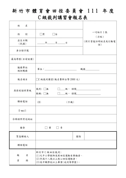 九十五年台北市C級田徑教練講習報名表-新竹市體育會田徑委員會111年度