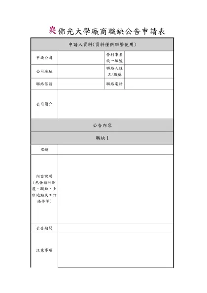 佛光大學廠商職缺公告申請表-申請人資料(資料僅供聯繫使用)