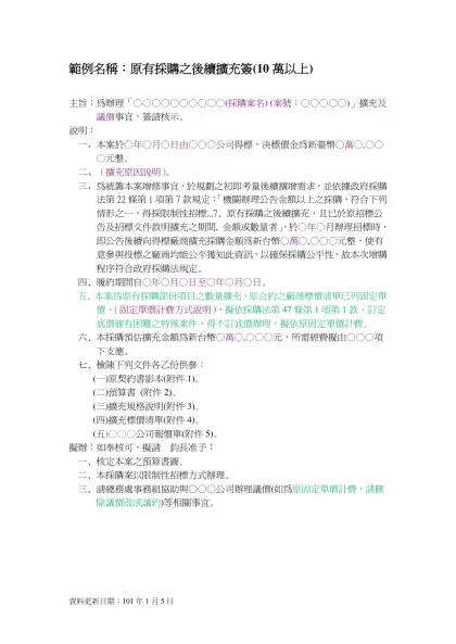 簽呈範例-範例名稱:原有採購之後續擴充簽(10萬以上)