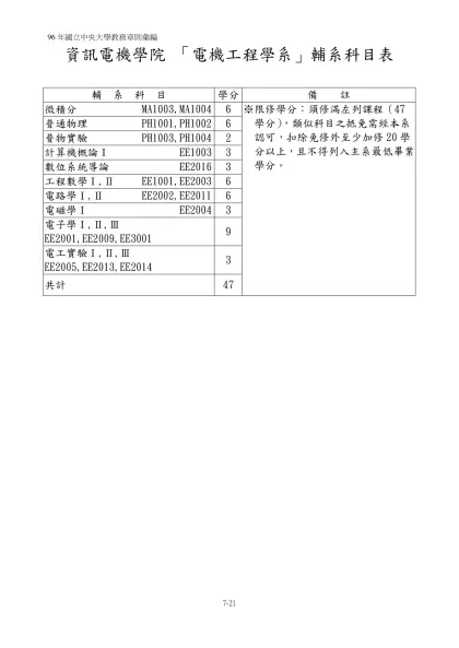 「中國文學系」輔系科目表-資訊電機學院 「電機工程學系」輔系科目表