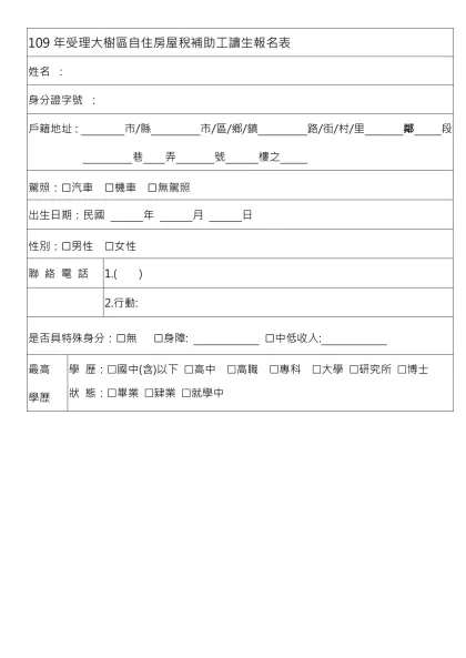 1111人力銀行求職履歷表-109年受理大樹區自住房屋稅補助工讀生報名表