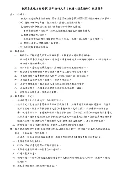 台灣高雄地方法院八十九年甄選聘用法官助理甄試簡章-臺灣嘉義地方檢察署110年臨時人員(觀護心理處遇師)甄選簡章
