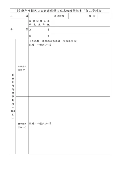 履歷表-110學年度輔大日文系進修學士班寒假轉學招生「個人資料表」
