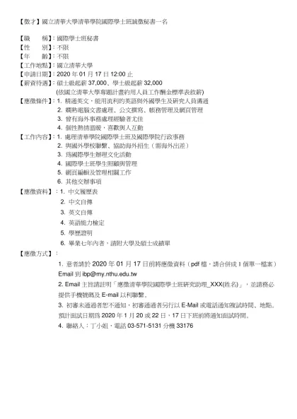 【徵才】國立清華大學清華學院國際學士班誠徵秘書一名 【職 稱】:國際學士班秘書 【性 別】:不限 【年 齡】:不限 【工作地點】:國立清華大學 【申請日期】:2020年01月17日12:00止