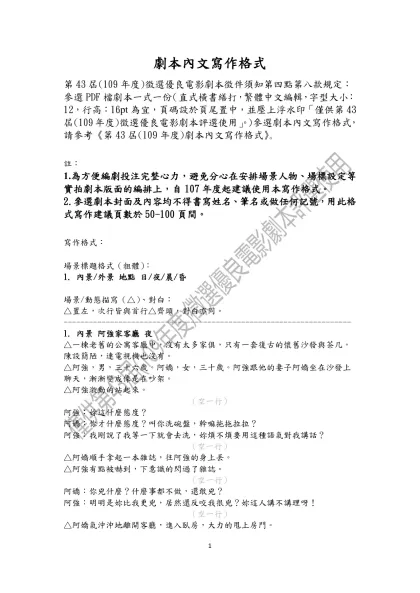 劇本內文寫作格式-第43屆(109年度)徵選優良電影劇本徵件須知第四點第八款規定: