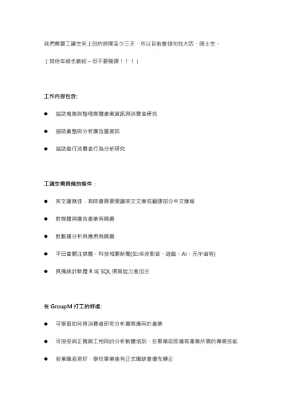 我們需要工讀生來上班的時間至少三天,所以目前會傾向找大四、碩士生。