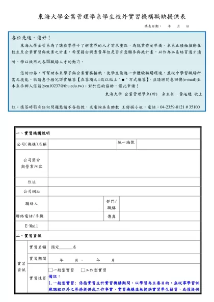 東海大學企業管理學系學生校外實習機構職缺提供表