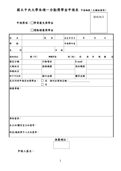 國立中央大學朱順一合勤獎學金申請表 申請編號(生輔組填寫)