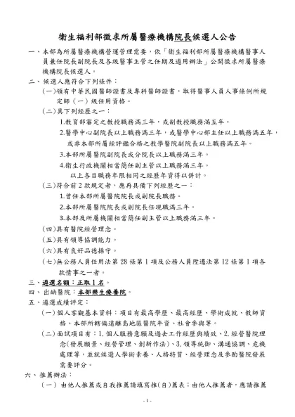 機關地址:台北市北投區立農街二段一五五號-衛生福利部徵求所屬醫療機構院長候選人公告
