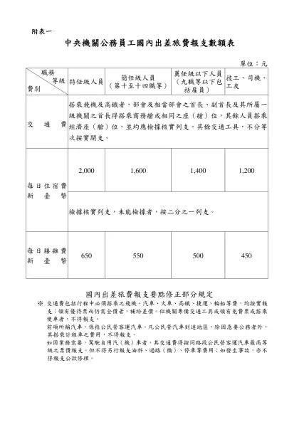 員工出差申請單-附表一-附表一中央機關公務員工國內出差旅費報支數額表