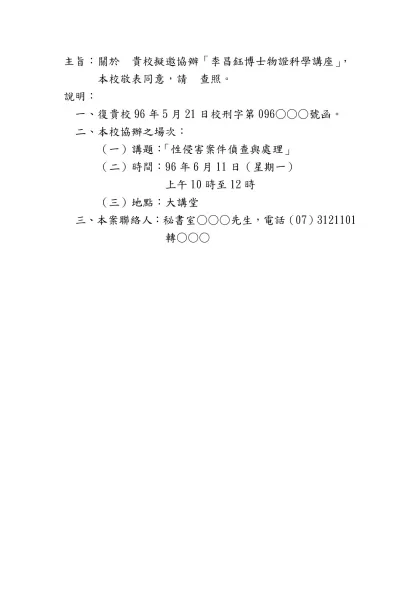 主旨:關於 貴校擬邀協辦「李昌鈺博士物證科學講座」,本校敬表同意,請 查照。