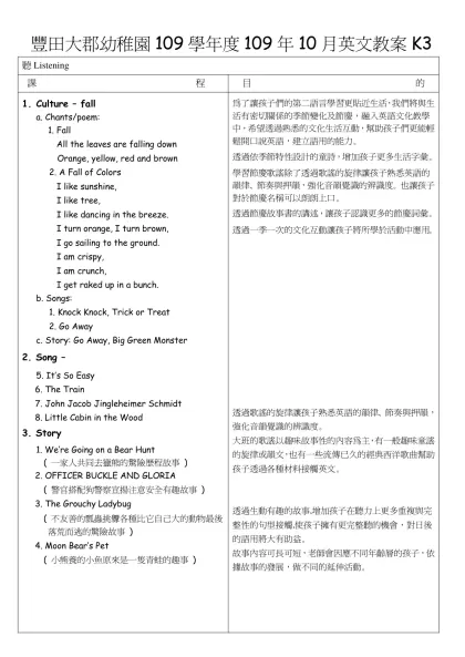 豐田大郡幼稚園99學年(下) 100年3月英文教案K3-豐田大郡幼稚園109學年度109年10月英文教案K3