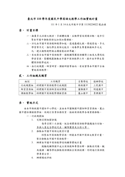 臺北市110學年度國民中學英語文教學工作組實施計畫